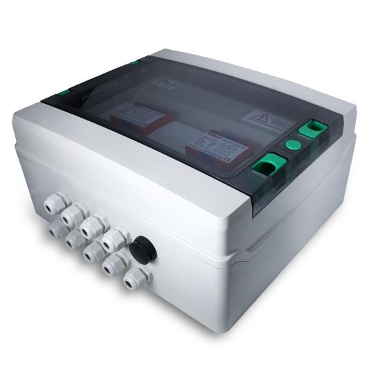 Anschlussfertige Generatorbox mit Überspannungsableiter gem. DIN EN 62305-3 Beiblatt 5 (VDE 0185-305-3 Beiblatt 5) Bemessungsspannung DC 1000V zum Anschluß von bis zu 2 Modulsträngen und 2 Wechselrichtern. Erweiterbar durch Kombination von mehreren GENBoxen. Durch den Einsatz unseres leckstromfreien Ableiters PV20C/DC1000 absolut verlustfrei.