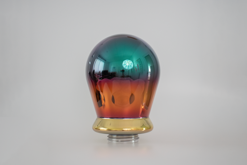 Ein weiteres innovatives Highlight sind unsere verspiegelten Leuchtenkörper. In einem Spezialverfahren werden sie im Vakuum mit einer metallischen Spiegelschicht versehen. Diese verspiegelte Schicht wird im Inneren des Produkts aufgebracht und dann versiegelt (Korrosionsschutz). Durch unterschiedliche Methoden der Metallisierung, kann eine blickdichte oder teildurchlässige Verspiegelung erzielt werden.