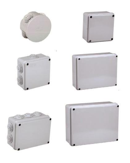 The FAEG range of surface mounting watertight junction boxes includes an IP44 series with snap-on cover and walls with cable glands, an IP55 series with screwed cover and walls with cable glands, another IP 56 series with screwed cover and smooth walls.