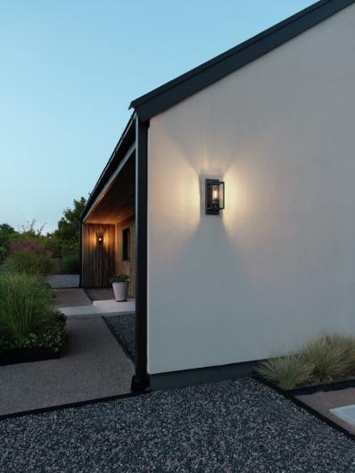 Moderne Außenwandleuchte in Anlehnung an klassiche Designs. Unaufällige integriertem Demmungssensor. Großer Echtglaszilinder mit Platz für hohe E27 LED Filammentleuchtmittel.