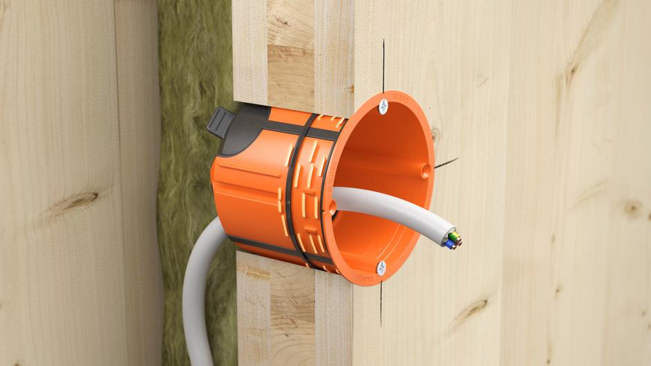 Mit der neuen Geräte-Verbindungsdose O-range ECON® Fix wird die Installation dank laschenloser Klemmrippen-Befestigung in unterschiedlichen Wandmaterial-Kombinationen wie OSB-Platten, Brettsperr- bzw. Massivholz, Gipsfaserplatten oder auch im Sichtmauerwerk deutlich schneller und leichter. Umlaufende Dichtlamellen auf zwei Ebenen garantieren den Erhalt der luftdichten Ebene. Durch die aufgebrachten Zentrierstege wird eine exakte und komfortable Montage der Geräte-Verbindungsdose in der Installationsöffnung ohne Verkanten ermöglicht. STECKEN – AUSRICHTEN – KLEMMEN – FERTIG!