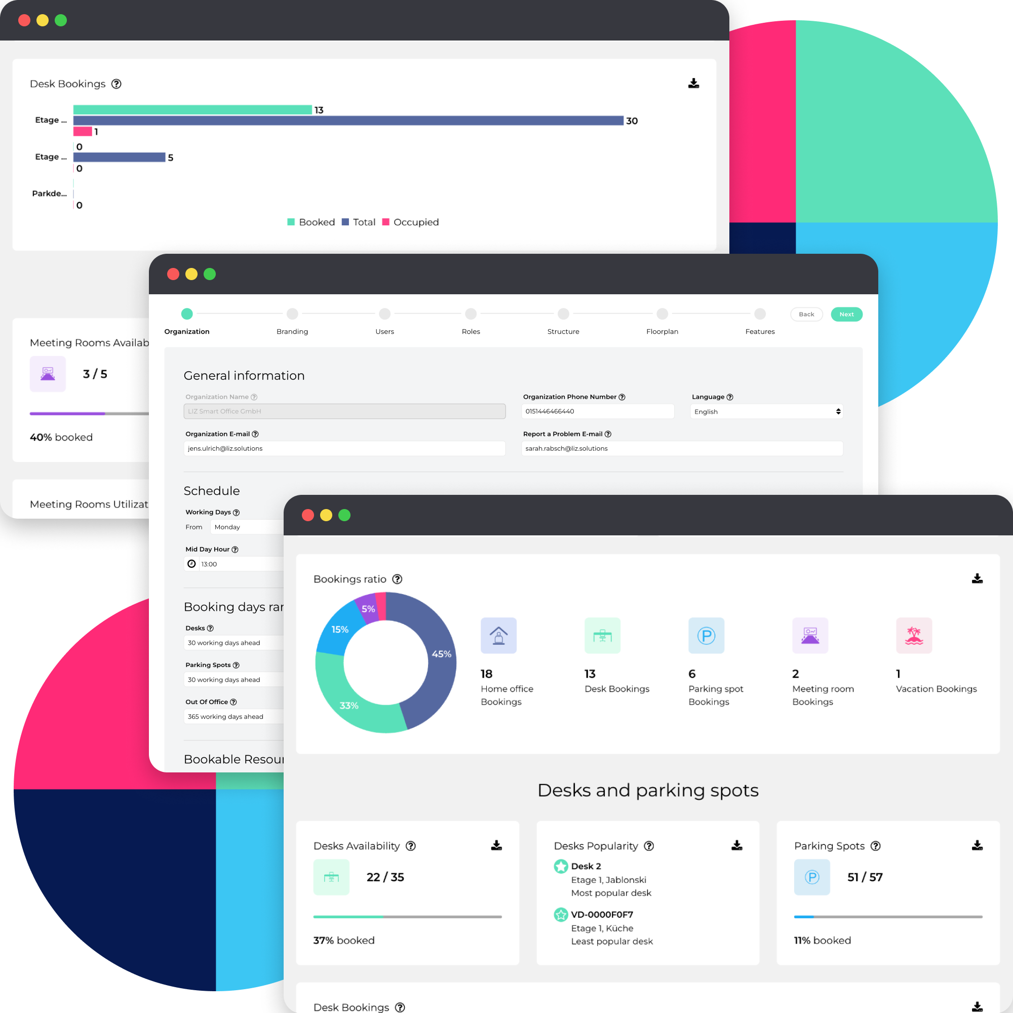 LIZ Booker integriert sich nahtlos in HR Systeme, Microsoft 365 und weitere bestehende Unternehmenslösungen, um ein konsistentes Nutzungserlebnis zu ermöglichen. Das ausgereifte Rollen und Rechte System stellt sicher, dass Mitarbeitende nur jene Ressourcen sehen und buchen können, die für sie relevant sind.