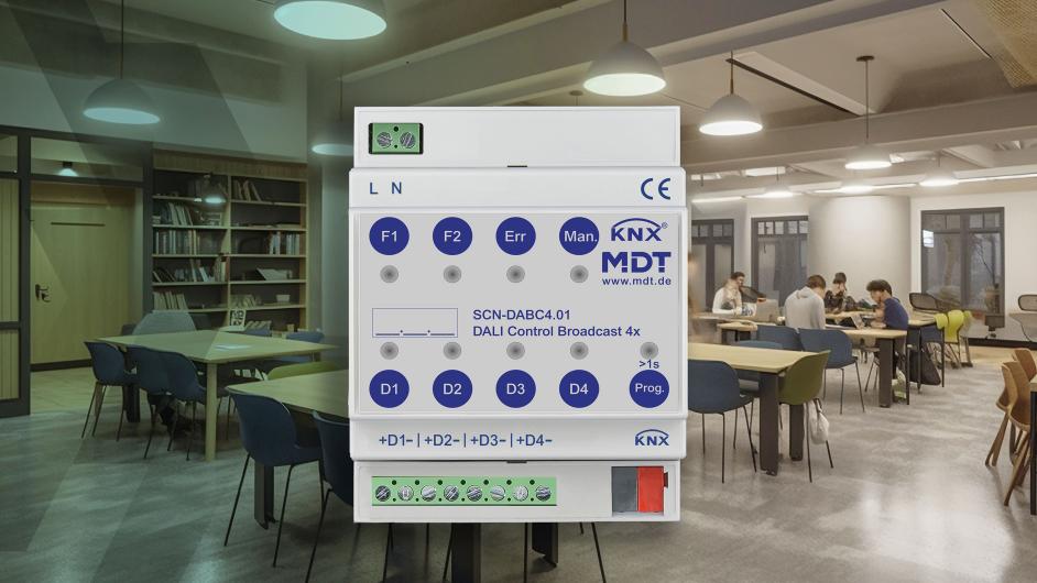 Mit dem neuen MDT DALI Control Broadcast Gateway können DALI-Leuchten einfacher und schneller in Betrieb genommen werden: die einzelnen EVG-Adressen müssen nicht ins Gateway einprogrammiert werden, da die Leuchten alle gemeinsam gesteuert werden. Das neue MDT DALI Control Broadcast Gateway unterstützt die Standards DALI und DALI-2, und ist ein KNX Data Secure Gerät. Eine Inbetriebnahme ist ab ETS 5.7.3. möglich.