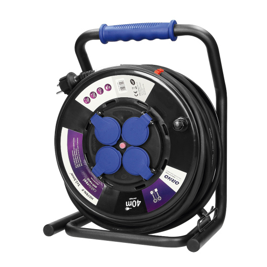 Verlängerungskabel auf einer Auwickeltrommel mit innovativem Anti-Verdrehsystem (feste Steckdosen), originellem Metallständer CUBE und Überlastschutz in Form eines Thermoschalters. Gummikabel, ölbeständig H07RN-F, Länge 40m. Sie verfügt über 4 Netzsteckdosen mit Erdung, Membranen für Stromleitungen und Dichtungsabdeckungen, die vor Schmutz und Wasser schützen, einen komfortablen Gummitragegriff, einen Drehgriff zum Aufwickeln des Kabels, eine Drehsperre der Trommel und einen gegossenen Stecker IP44. Angepasst an schwere Einsatzbedingungen, auch für den Außenbereich geeignet.