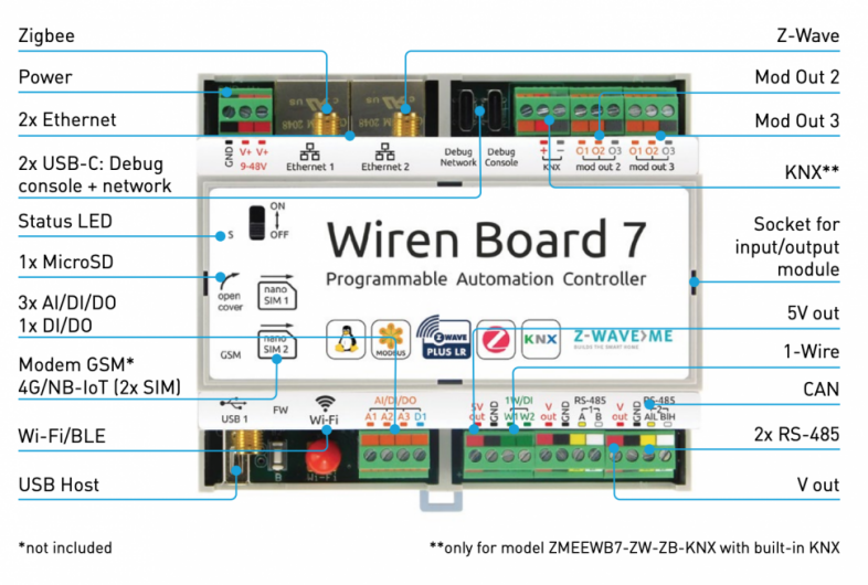 Z-Wave.Me Wiren Board 7 ist ein modularer programmierbarer Controller zur Automatisierung von Wohnungen, Häusern und Büros. Der Controller kann mit kabelgebundenen und kabellosen Sensoren und Aktoren arbeiten. Unterstützung für die drahtlosen Hausautomationsprotokolle Z-Wave und Zigbee wird durch eine spezielle Erweiterungskarte und die Z-Way-Software von Z-Wave.Me bereitgestellt. Der Controller hat die Z-Wave-Zertifizierung bestanden, die die Kompatibilität mit allen zertifizierten Z-Wave-Geräten garantiert.