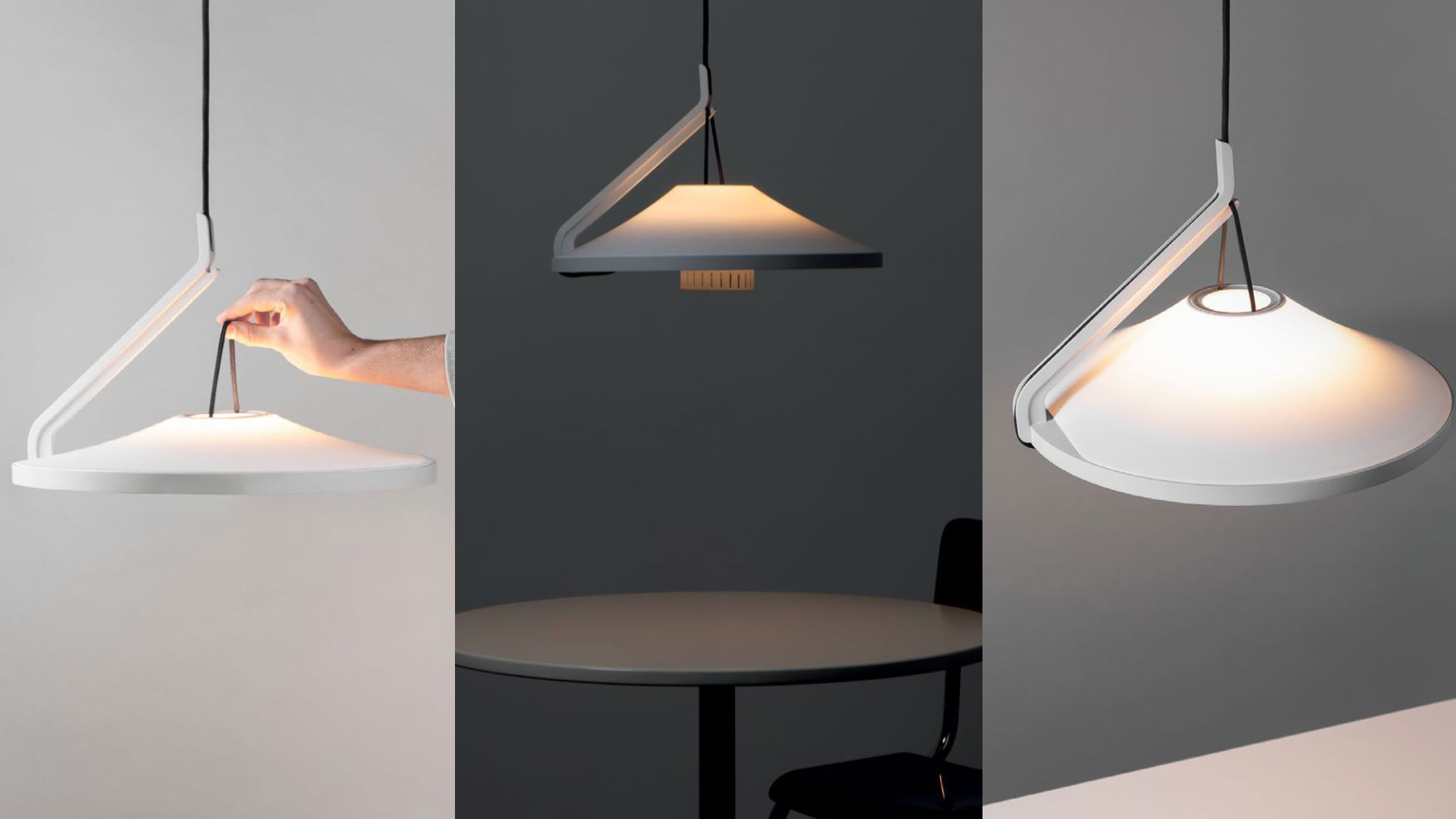 Je stärker der Stoff gespannt wird, desto heller füllt das weiche Licht den sich vergrößernden Diffusorkegel. Wird die Bewegung umgekehrt, verwandelt sich der Diffusor wieder in eine flache textile Fläche, die das Licht zurück nach unten in einen fokussierten Lichtspot drückt.