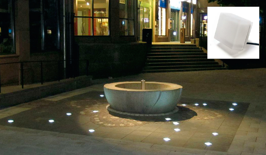 Glass pavers with IK10 rating for heavy traffic in single colors (LED IP67) or color change (fiber optics IP68). For installation in walls, floors or underwater.