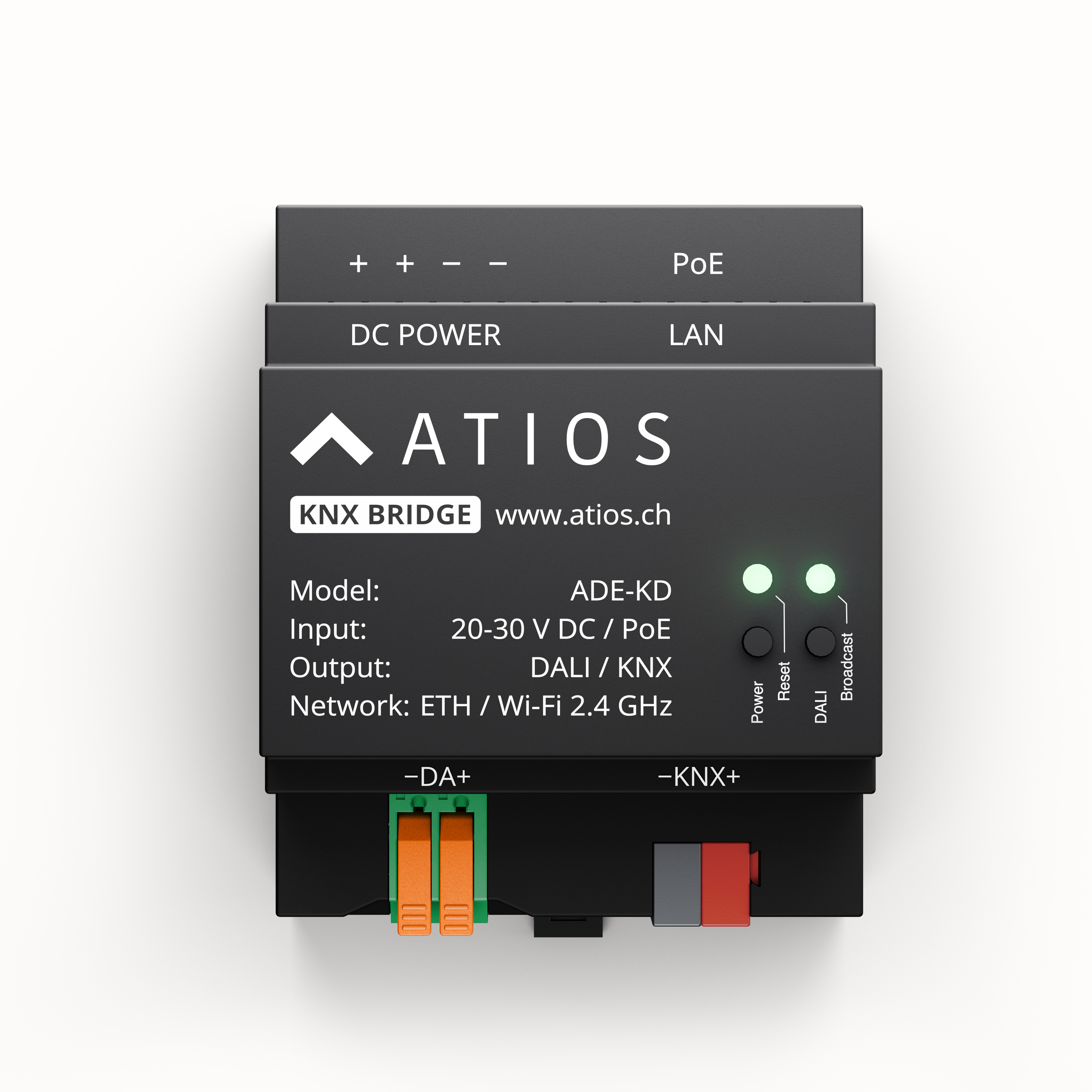 Atios LumaPort is a Matter bridge for Casambi wireless lighting systems. It integrates up to 250 Casambi fixtures into KNX for app and voice control via Apple Home, Google Home, Samsung SmartThings, Amazon Alexa, and Home Assistant. Full lighting control is supported, including switching, dimming, color, up/down fading, and height adjustment. New firmware updates will add DALI compatibility (Q1 2026), connecting Casambi devices directly to your DALI infrastructure. Matter operates locally without relying on cloud services. Powered by PoE+, with DIN rail mounting for easy installation. Engineered in Switzerland.