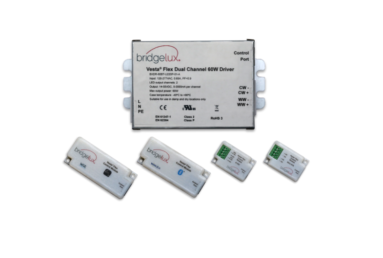 Vesta Flex is a family of dual channel LED drivers, with wired and wireless control modules designed to reduce the cost of connected, tunable white luminaires. Compatible with many communications protocols, this system enables simplified, future-proof design flexibility for lighting OEMs. The multiple, plug-and-play controls are customized to work with Bridgelux Vesta Series tunable white LED light sources.