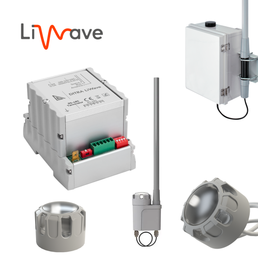 The DITRA LiWAVE Gateway is installed inside the lighting control cabinet and links LiWAVE Nodes to cabinet controllers via RS-485 (MODBUS). It acts as a radio master, enabling remote configuration, data exchange, and diagnostics.