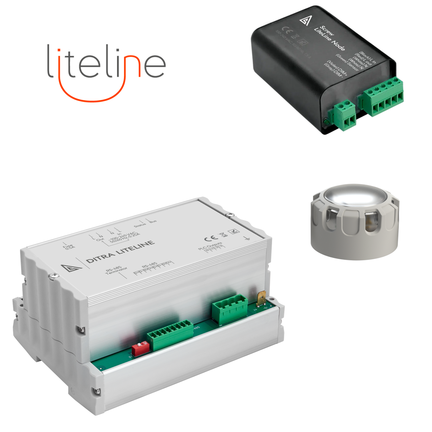DITRA GSM Node operates from 110–240 V and supports luminaires up to 1000 W. The IP66 housing ensures reliable operation in outdoor environments, while the wired connector simplifies installation inside existing terminal blocks.