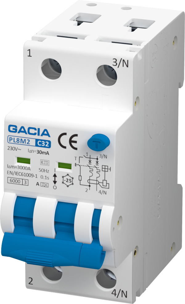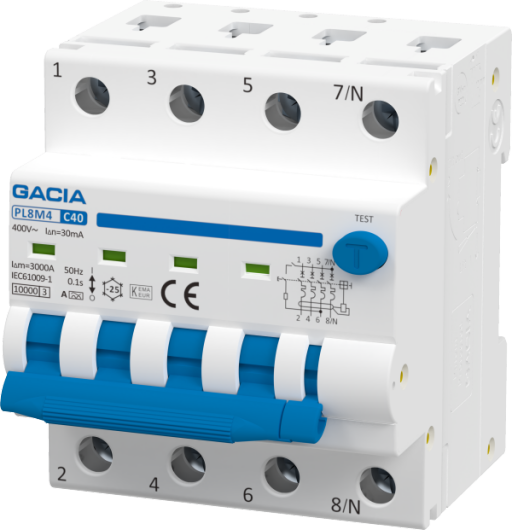The PL8M4 residual current circuit breakers combine a residual current device based on permanent magnet technology with a circuit breaker featuring thermal overload and magnetic short-circuit protection. This design ensures the residual current device operates independently of voltage.