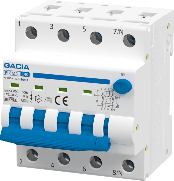 PL8M1N residual current circuit breaker are based on combination of residual current device with permanent magnet principle and circuit breaker with thermal overload release and magnetic short circuit current release. It brings the advantage of voltage independent function of the residual current device.