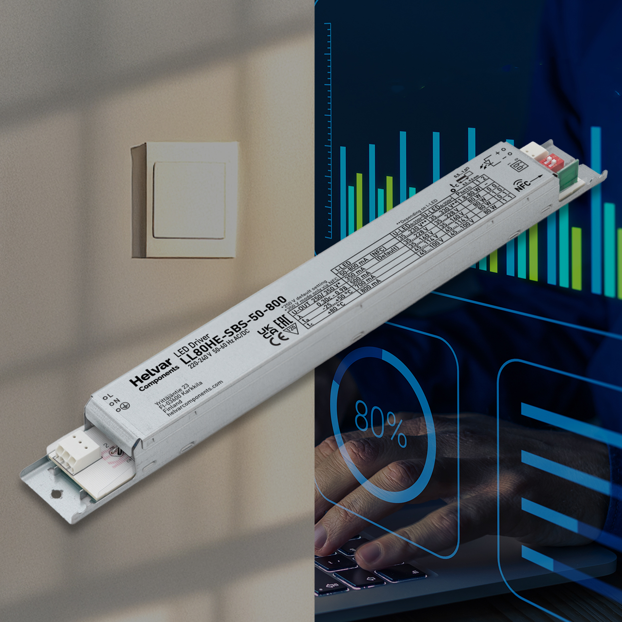Output current of the 35 W, 50 W and 80 W models can be set conveniently with DIP switches, and that is not all! Through Helvar Components’ innovative Smart Switch technology, the DIP switch current values for different positions can also be programmed with NFC or DALI bus by the user to differ from the factory defaults! Program your custom output currents in our Helvar Driver Configurator tool and driver will follow this in DIP switch setting.