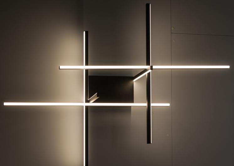 A lighting fixture with a simple design and straight lines comprised of overlapping LED lines in 90-degree angles. The geometric shapes and modern technology create an impressive visual effect.