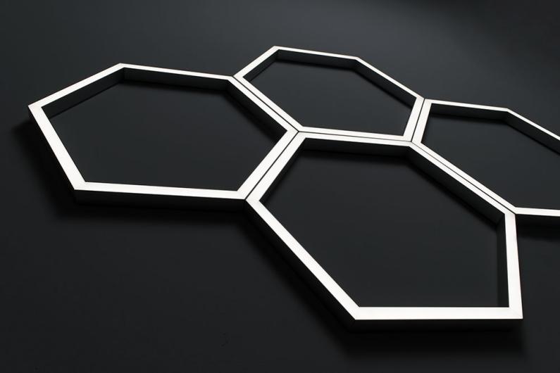 HEXAGON, a modern luminaire inspired by the intricate beauty of honeycombs. This beautiful design combines precision-cut anodized aluminum profiles to form a durable skeletal structure that effortlessly integrates into any professional setting. HEXAGON offers versatile installation options, allowing you to either suspend it from the ceiling or attach it to the wall.