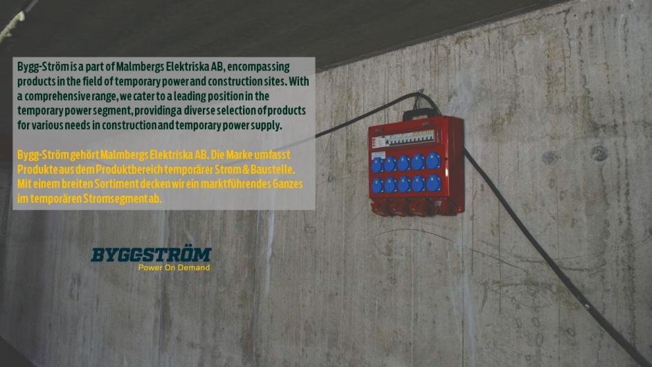 Discover the power of Bygg-Ström, an integral part of Malmbergs Elektriska AB, specializing in cutting-edge products for temporary power and construction sites. With an expansive range, we proudly hold a leading position in the temporary power segment, offering a diverse selection of solutions tailored to meet various construction and power supply needs.