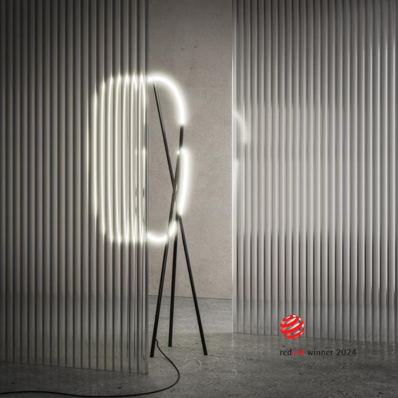 The idea of ​ ​ the collection is to combine the traditions of ancient crafts with modern technology. This floor lamp combines knitting, which is one of the most ancient types of decorative art, with the latest LED cord technology. The metal construction of the lamp resembles the interweaving of spokes during the knitting process, and the LED flexible cord resembles woolen threads. When developing this collection, special attention was paid to the shape of the LED cord so that it would make an oval. This approach made it possible to create a unique form of floor lamp.