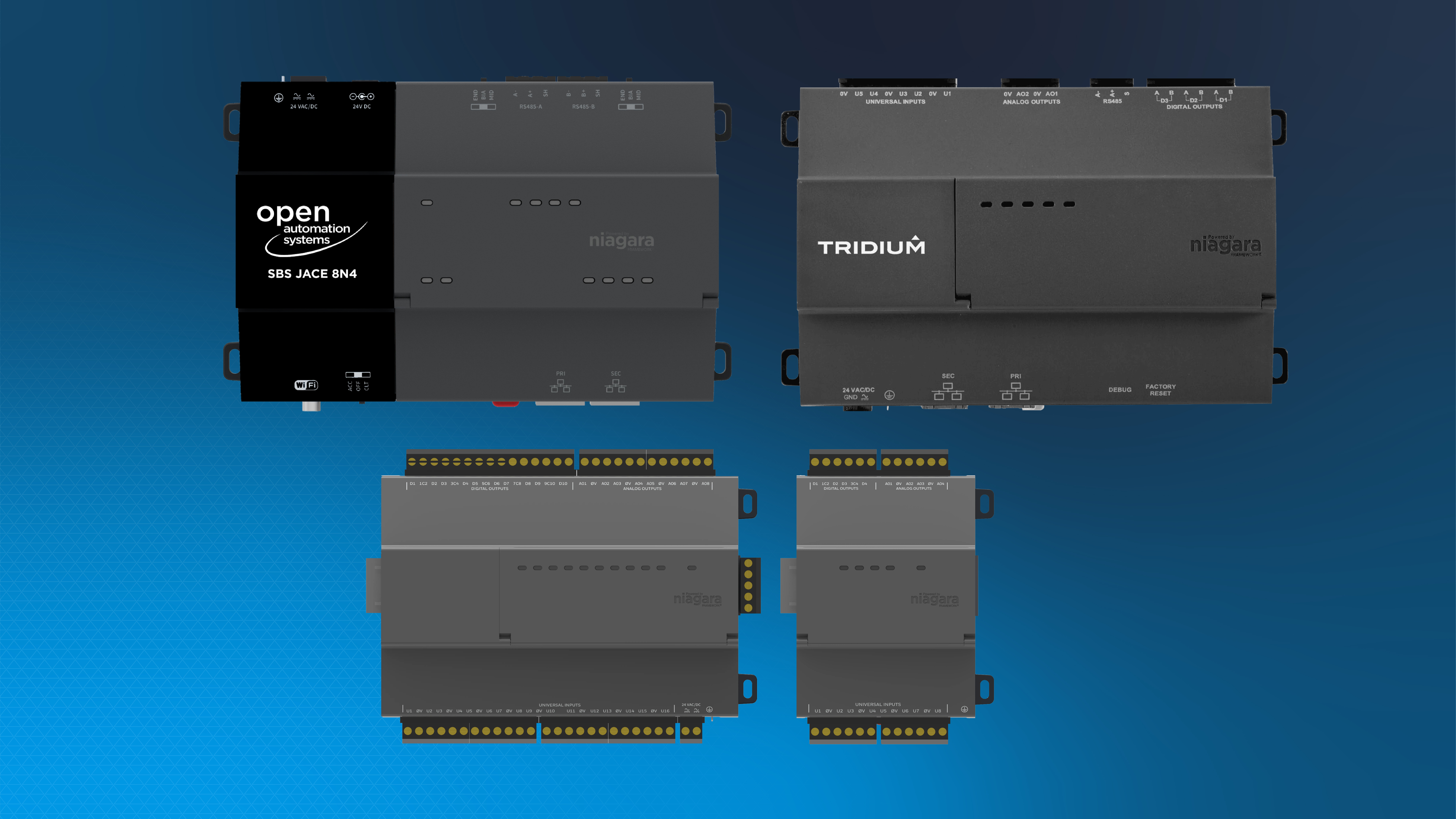 Binary, digital and analogue signals are recorded, output and processed in the automation stations (Niagara platforms) at various points in the building and the building services systems via the SBS-IOM devices. The connection with the automation station takes place via a commercial RS 485 communication bus / MOD bus RTU.