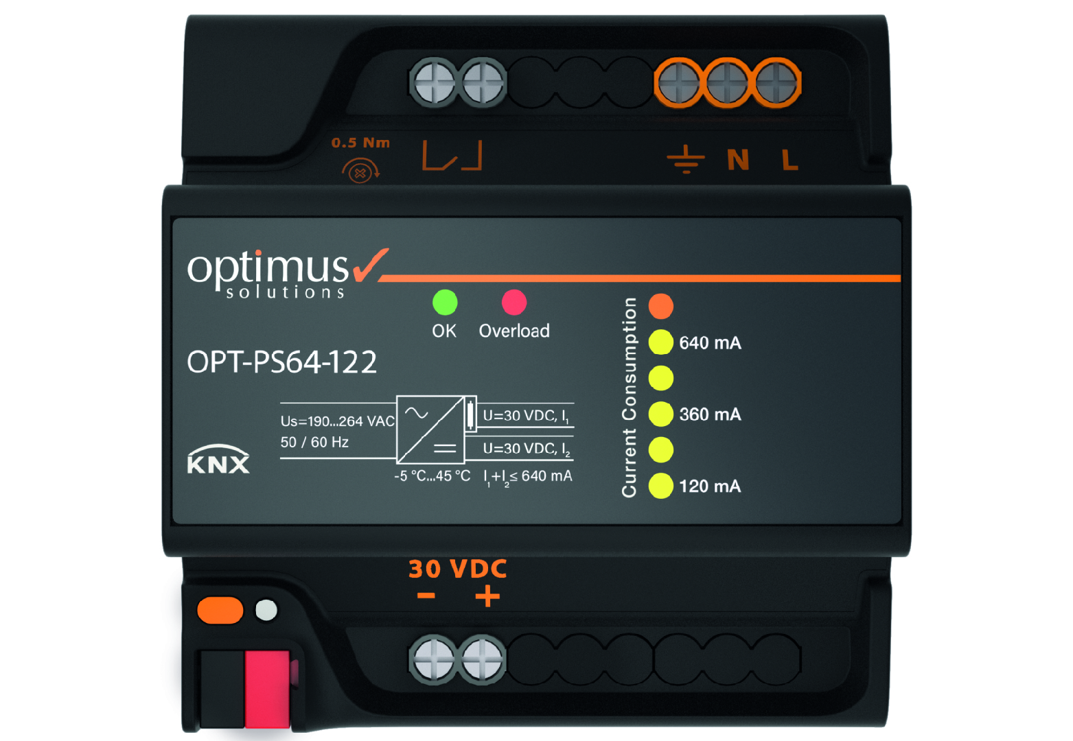 In input mode, the status of the contact is detected, and appropriate information in the suitable data type is transmitted to the KNX line. In output mode, the LEDs to be connected can be turned on or off according to the information coming from the KNX line. The Optimus Universal Interface is powered