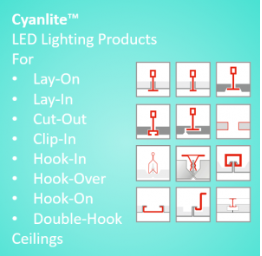 Cyanlite LED panel lights include professional lighting solution for all kinds of ceiling systems, including the normal Lay-On ceiling(T15/T24 T-bar ceiling), as well as plasterboard ceiling and metal ceiling systems, such as Clip-In ceilings, Hook-Over ceilings, Hook-On ceiling, Hook-In ceilings etc., and suitable for the major global ceiling brands such as SAS, Armstrong, AMF, BURGESS, OWA, FURAL and so on.