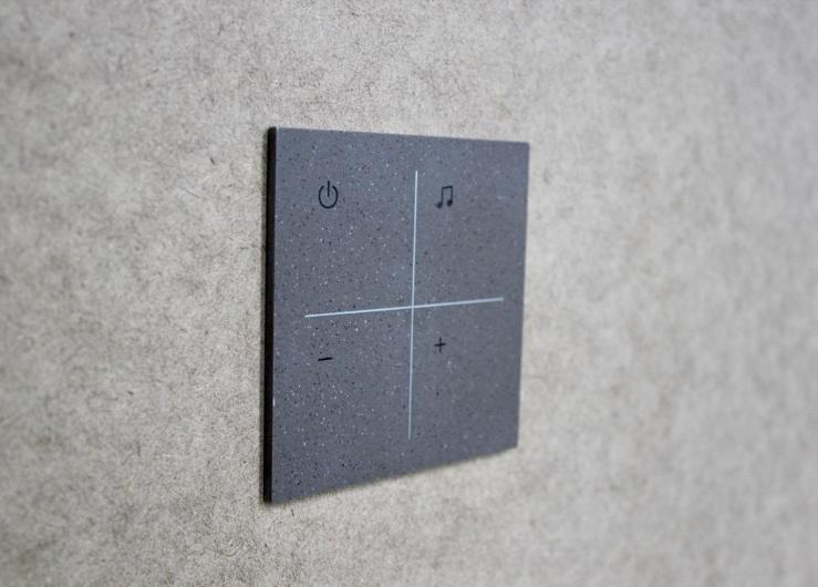 Touch switches from material like a stone with engraved icons make it easy to control your light, shades, music, and others.