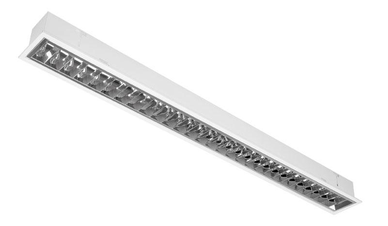 Recessed LED luminaire for mounting in ceilings with polished aluminum louvre. The luminaire has a low UGR glare factor and therefore is suitable for use in offices.