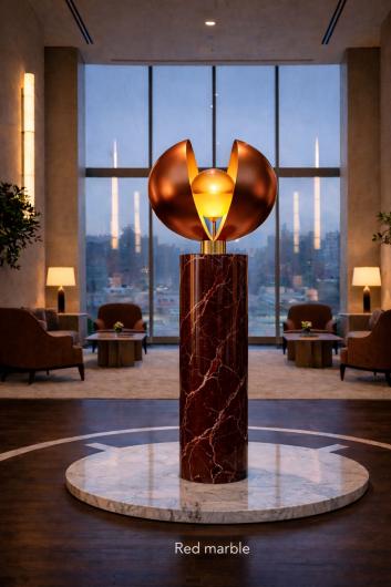 At its core, a sphere — the symbolic heart of the piece. Around it, precision-engineered metal structures form a timeless silhouette suitable for hotel lobbies, galleries, high-end residences, and architectural atriums.