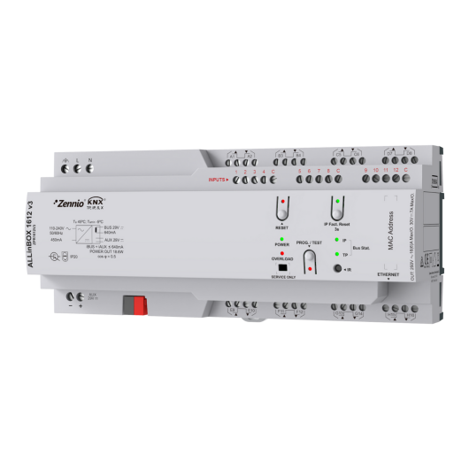 REF: ZPR1612V3The starting point for most projects incorporating control and monitoring functionalities. Multifunction device that integrates a 640 mA KNX power supply, KNX-IP Interface, 4 independent thermostats, logical module, 12 analog/digital inputs and 16 relay outputs (16 A C-Load) in only 12 DIN rail units. Offers multiple configuration options as individual outputs, shutter channels or fan coil controller (2/4 pipes).