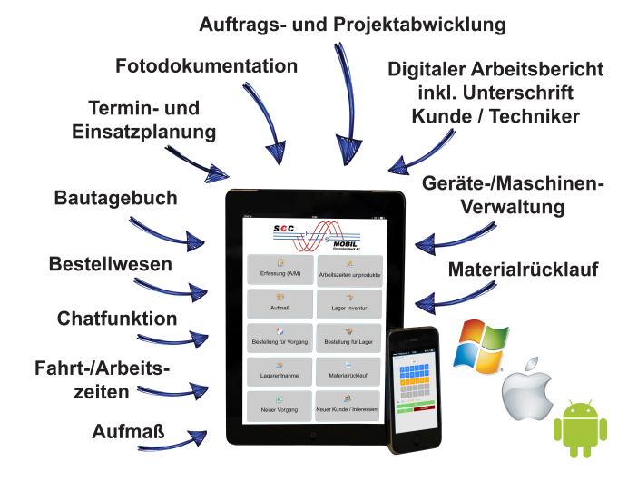 Mit der APP SCC-MOBIL 4.1 kann der Monteur direkt beim Kunden bzw. auf der Baustelle Zeit, Aufmass, Bautagebücher und Bestellungen erfassen sowie Aufträge bearbeiten und sofort mit dem Büro synchronisieren. Dies eröffnet enorme Zeit- und Kosten-Einsparpotentiale und ist ein weiterer Schritt gegen die „lästige“ Zettelwirtschaft und Informationsflut im Büroalltag.